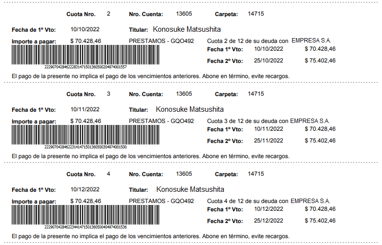 Los cupones de cobranzas disponen de código de barras para pagar en Western Union. El Software de cobranzas con generación de código de barras está compuesto por programas para generar talones de pago que disponen de códigos de barras. Los ejemplos de códigos de barras se pueden ver en facturas de servicios.