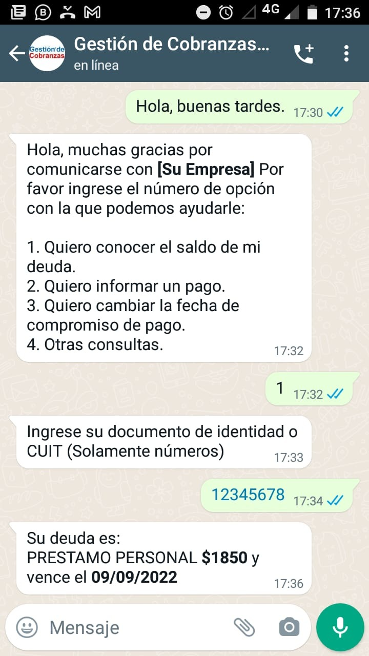 El software de cobranzas con gestión de cobranzas con uso de WhatsApp y Chatbot integrado permite configurar distintas programaciones de preguntas y respuestas a los efectos de lograr una gestión de cobranzas desatendida para cuestiones que no requieren participación de un ser humano. Esto no quiere decir que se deja de lado la participación del ser humano. Todo lo contrario. Se le da verdadero valor al recurso humano, ya que se lo utiliza para etapas de la gestión de cobranzas más complejas.